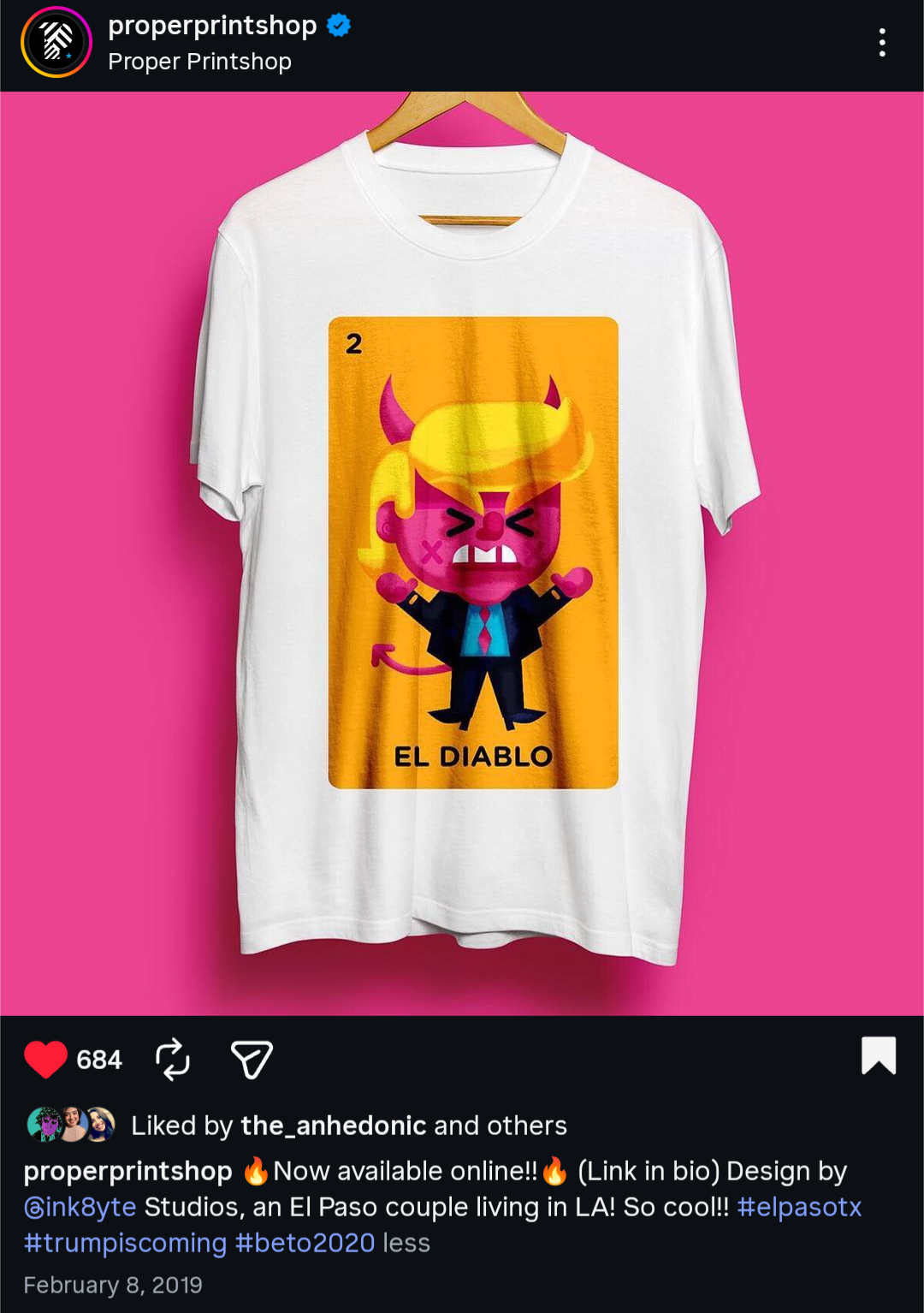 For the “Best Trump Design Wins 25 Shirts” contest hosted by Proper Printshop, I created an anti‑Trump shirt riffing on the iconic “El Diablo” Lotería card to communicate political critique through cultural visual language. The design reimagines the traditional card’s devil figure to deliver a provocative message that works on both merchandise and social feeds.